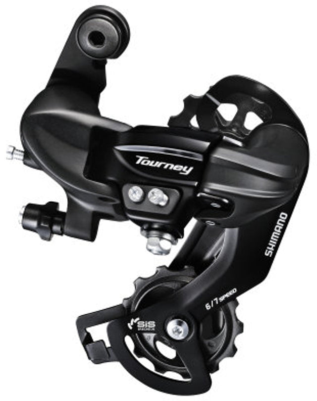 De Shimano Tourney RD-TY300 achterderailleur is geschikt voor 6- en 7-speed schakelingen en wordt geleverd met een adapter. Het biedt een betrouwbare en precieze schakelervaring.