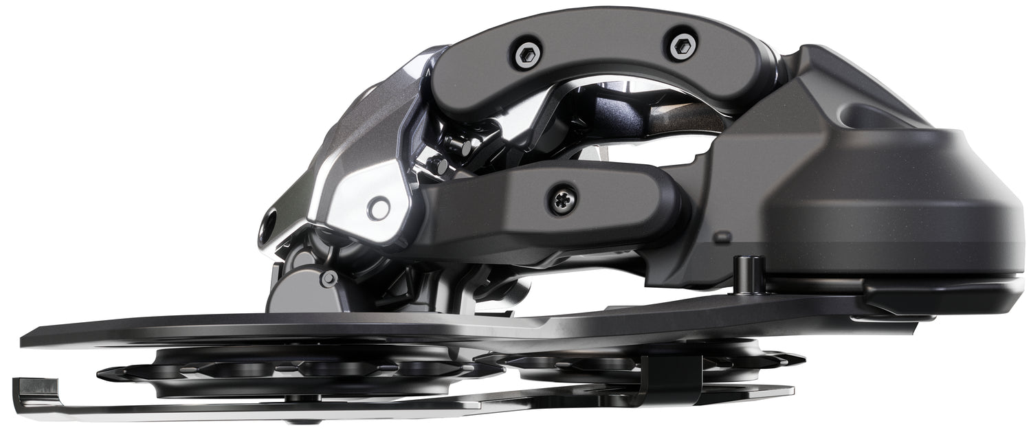 Robuuste constructie: Een brede scharnierstructuur, het glijplaatontwerp, de duurzame carbonplaat en massieve derailleurwieltjes geven de derailleur stevigheid en duurzaamheid, terwijl de nieuwe smalle stabilisator het systeem soepel laat lopen.